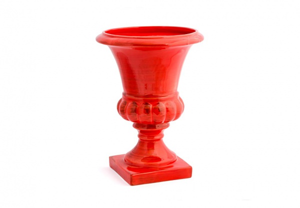 • Vaso  Medici em cerâmica italiana estilo neoclássico ,  esmaltado e vitrificado na cor vermelha  , com borda expandida, corpo central com gomos em relevo, haste torneada e base quadrada,   , medindo 27 x 36 cm ( D x A )