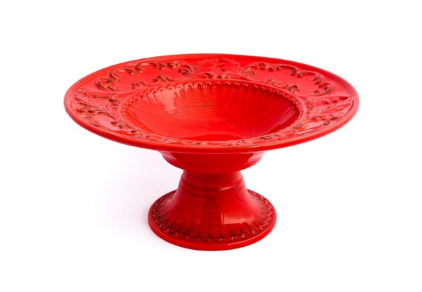 • Centro de mesa / fruteira em ceramica italiana na cor vermelha  com rica decoração em relevo no bojo e na aba, apresentando motivos vegetalistas estilizados. Corpo circular com cavidade central funda e borda larga trabalhada, apoiada sobre haste  , medindo 37 x 19 cm