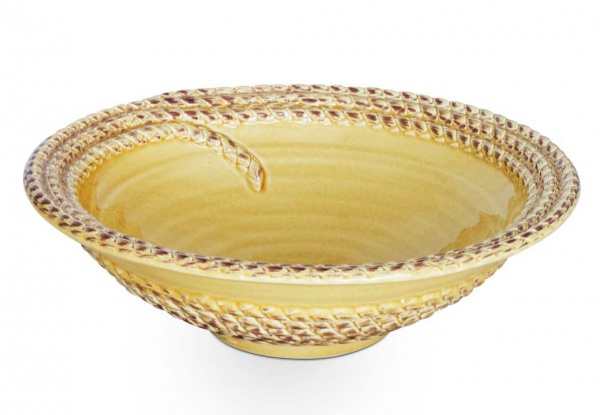 • Elegante centro de mesa ou fruteira em cerâmica italiana , esmaltada em tonalidade amarelo  decoração em alto-relevo  contornando toda a borda com rica textura  , medindo 32 x  10 cm