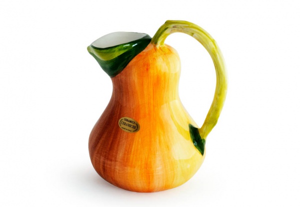 • Jarra em cerâmica italiana  em formato de pera com acabamento policromado em degradê de tons amarelo, laranja e verde. Bico vertedor integrado à folha superior e alça curva estilizada como caule, medindo  L: 22 cm x P: 17 cm x A: 24 cm
