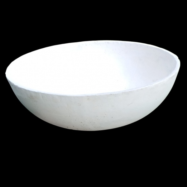 • Grande cachepot  no estilo Willy Guhl  em cimento/concreto pintado de branco formato redondo ,  sem marca de fabricante visível, medindo 57 x 18 cm de altura, marcas do uso.