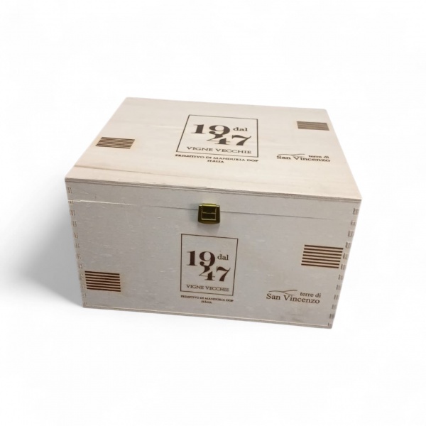 • Caixa original em madeira para vinho italiano 19 dal 47  Vigne Vecchie, Terre di San Vincenzo, Primitivo di Manduria . Peça em madeira clara com fecho metálico dourado, impressão original da vinícola.   Excelente estado de conservação. Medindo 20 x 33 x 30 cm