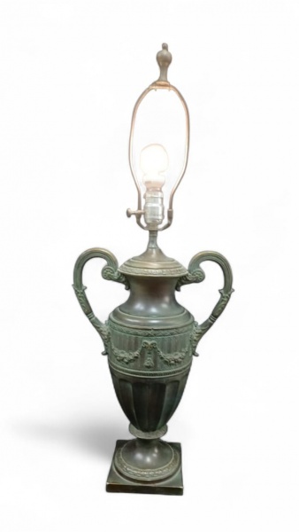 • Antiga luminária  de mesa Americana marca LEVITON em metal no estilo neo - clássico  em   formato de ânfora em ornamentado  em relevo com  guirlandas de flores , medindo 82 cm de altura , Funcionando.