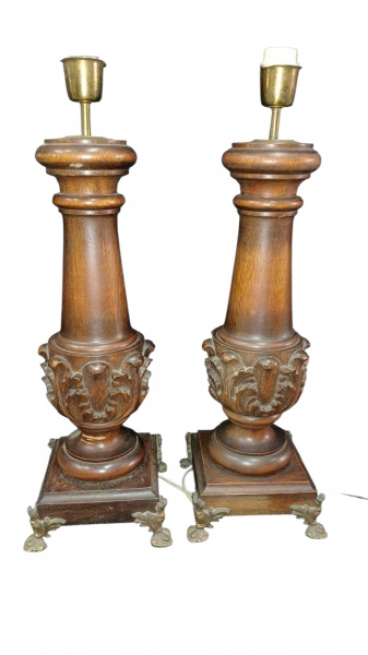 • Par  de  abajour em pesada madeira decorada por floral e detalhes em relevo, base quadrada e pés em metal , altura 53 cm  OBS: necessita reparos ,  sem cúpulas , não testado. VEJA IMAGENS EXTRAS