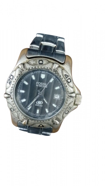 • Relógio de pulso - Em aço, FOSSIL BLUE -AM 3264- com data, resistente a água 50 metros. Visor em cristal , movido a bateria. funcionando. Marcas do tempo .