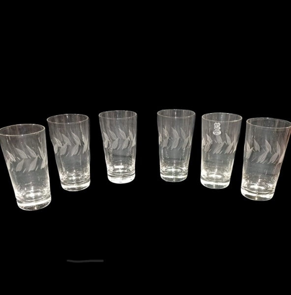 • CRISTAL HERING - Lote contendo seis (06) copos altos  em cristal Hering lapidado a mão no padrão dito  " folha " em baixo relevo, altura 14 cm