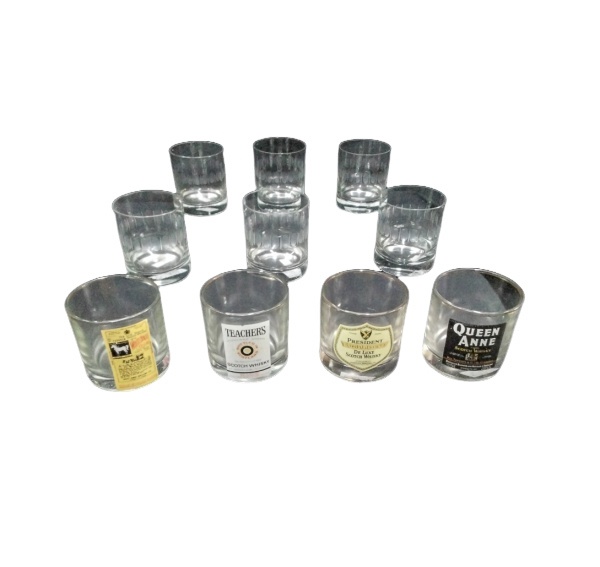• Conjunto com 10 copos para whisky em vidro sendo 4 com inscrições de nomes de marcas de whisky altura 8 cm ( impercptíveis bicados )