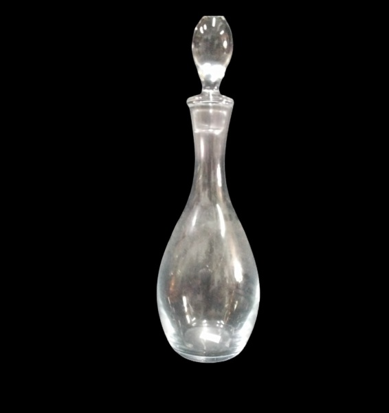 • Garrafa licoreira em vidro translucido  bojuda , tampa em formato de pinha ,altura 38 cm  (pequenos bicados no bocal)