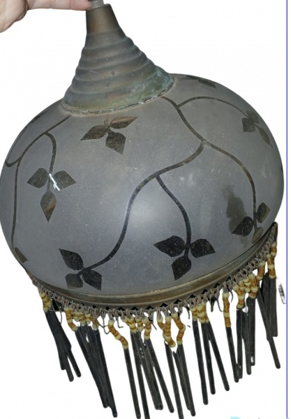 • Luminaria de teto em  metal  , cupula em vidro satinado deecorado com folhas , franjas compostas por  miçangas e canutilhos  e miçangas , medindo 24 x 27 cm Não testado , necessita fiação ( no estado) falta canutilhos