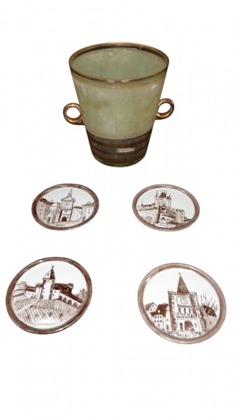 • Antigo  balde em vidro  com douração na borda, corpo e alças  em branco e dourado e 4 porta copos em porcelana Schmidt , medidas 14 x 13 cm e  9 cm