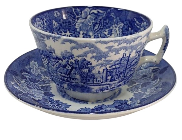 • Xícara de chá em faiança inglesa WOOD & SONS, com cena rural em tons de azu / branco . Medidas 6,5  alt. X  10 cm ,diâm. Pires 14 cm diâm. Veja imagens extras