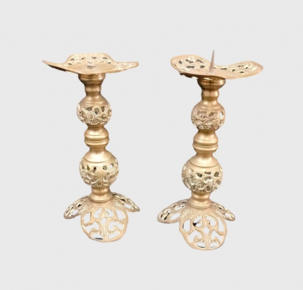 • Exótico e antigo par de castiçais de altar Budista  em   metal fenestrado e  polido,   século XIX . Base onduladas em três segmentos  ricos detalhes. Exemplares típicos de altares Japoneses chamados "BUTSUDAN".  Dimensões: 10  x 19  cm. OBS : Falta uma agulha