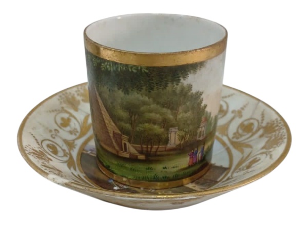 • Porcelana Italiana - PEÇA RARA-  Xicara da manufatura Capo- Di- Monte  - meados do Século XVIII , decoração  sobre fundo leitoso com pintura  à mão  " VEDUTA DEL POGGIO A CAIANO " no pires e " VEDUTA DELLA GHIACCIAIA DELLE CASCINE " na caneca .  Pires quebrado e colado , caneca perfeita. Medindo 7 x 6,5 cm VEJA IMAGENS EXTRAS