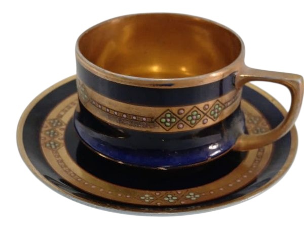 • LIMOGES -  Xícara para café em porcelana de Limoges na tonalidade azul cobalto ,  detalhes em dourado com miosotis azuis em relevo , interior em vermeil .Medindo 6 x 4 cm