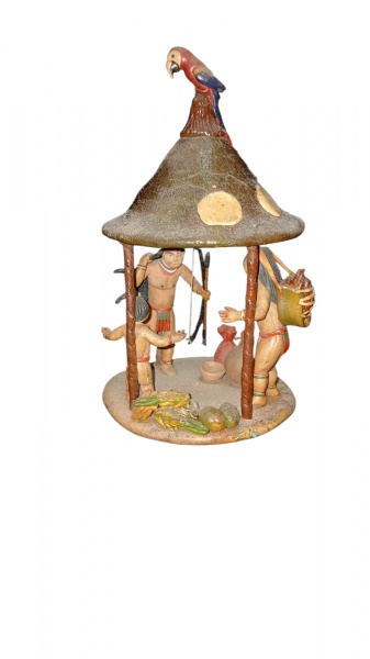 • Escultura artesanal  em Balata Macuxi "Maloca Indígena " representando cena da vida indígena, medindo 19 (h) x 11 cm base