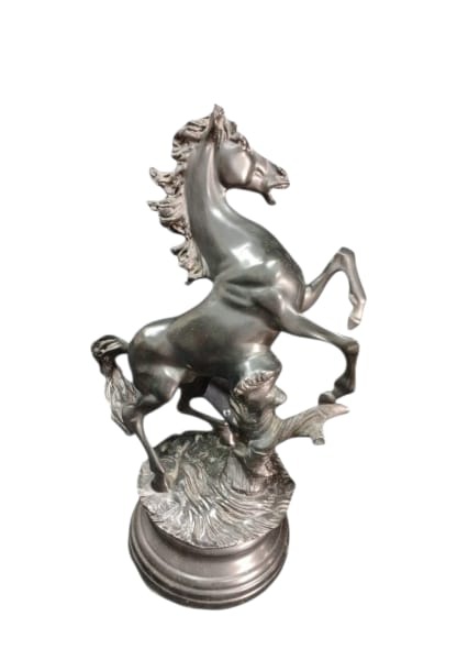 • Escultura Petit Bronze   figura de cavalo em movimento, rico trabalho de detalhes de acabamento, necessita restauro, medida total nos extremos: 50 x 32  cm VEJA IMAGENS EXTRAS