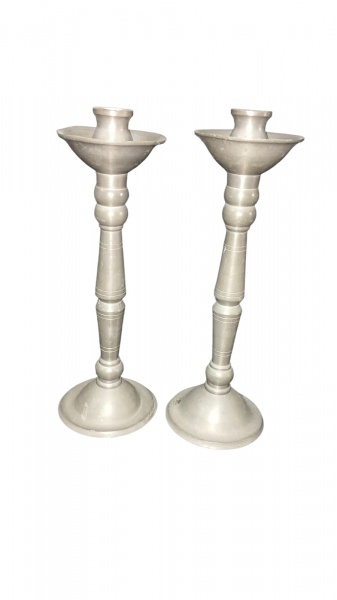 • Par de castiçais confeccionados em estanho, corpo balaustre, base circular cônica, altura 28 cm base 10 cm,  pequenos amassados , no estado , veja imagem extra