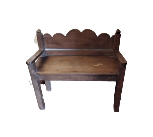 • Banco  rústico estilo mineiro de madeira nobre com encosto recortado, medindo 89 x 42 x 85 cm Marcas de uso.  Retirada com agendamento na Barra da Tijuca