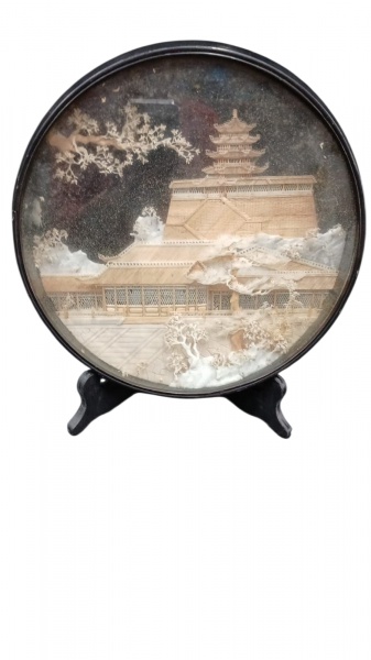 • Escultura decorativa chinesa em cortiça dentro de caixa de vidro com moldura em madeira e base destacada. Representa cena paisagística com pagode em relevo, ricamente trabalhados em cortiça natural. Objeto de grande delicadeza artesanal, típico do artesanato oriental do século XX. Medidas: profundidade 4 cm , diâmetro 29 cm . Obs: marcas do tempo.