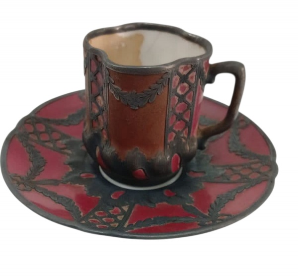 • Antiga xícara de porcelana possivelmente Francesa , não identificada ,  estilo Art Noveau , Século XIX , decorada com guarnição de prata sobre fundo vermelho. Marcas do tempo. Medindo 5,5 x 5,5 cm