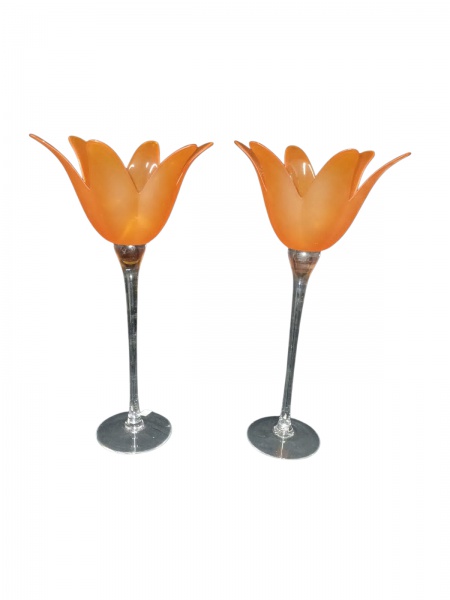 • Par de floreiras em murano italiano haste translucida e bojo laranja leitosa. Altura 39 cm