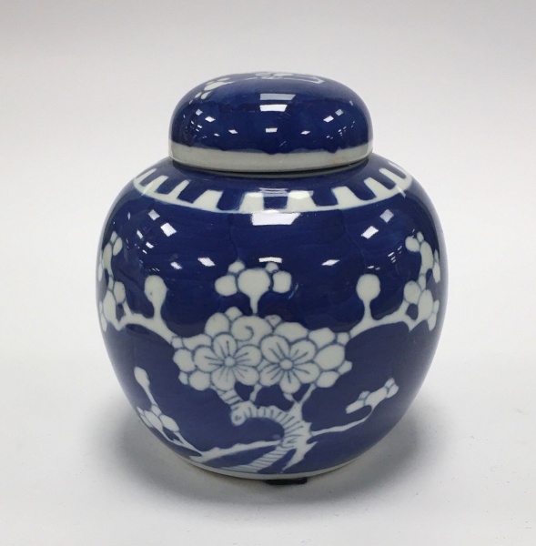 • China / Jingdezhen Blue and White Plum Blossom Ginger jar on Ice Ground Pote com tampa Azul e Branco, em porcelana de pasta dura. Design Flor de Ameixa sob solo de gelo. Esmalte azul e branco underglaze. Apreciado e clássico design dos letrados.  Marca no verso - "double rings". Excelente estado de conservação.Altura 12 cm x 12 cm