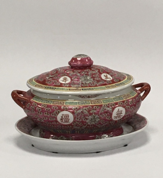 • China / Red Wan Shou, Jingdezhen, Famille Rose. Terrina oval com tampa e presentoir. Porcelana de pasta dura. Rica policromia em vermelho/rosa, pintada à mão overglaze. Clássico design Wan Shou Wu Jiang. A expressão Wan Shou Wu Jiang, usada desde 1100 A.C., significa Longevidade sem Limite, Existência Eterna. Marca no fundo. Altura 27cm x Comprimento 37 x Largura 27cm. Presentoir - 36 x 30 cm.  Excelente estado de conservação.