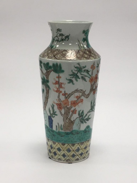 • China / Beijing  Marca Período Kangxi. Vaso em porcelana de pasta dura. Famille verde. Formato Rouleau. Rica policromia pintada à mão overglaze. São pintados exuberante pinheiro, elegante bambu e delicadas flores de ameixa. Símbolos de retidão, auto-cultivo e pureza. Altura 25 x 11 cm.