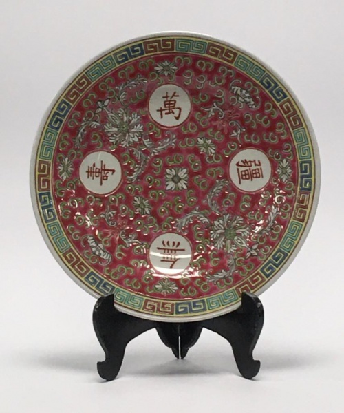 • China / Jingdezhen  Prato em porcelana de pasta dura, Famille Rose. Rica policromia em VERMELHO/ROSA, pintada à mão overglaze. A expressão Wan Shou Wu Jiang, usada desde 1100 A.C., significa Longevidade sem Limite, Existência Eterna. Marca no verso. Diâmetro 20.5 cm  Excelente estado de conservação