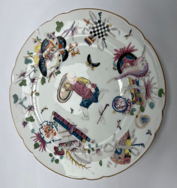 • China / Séc XVIII - Companhia das Índias. A FAMILLE ROSE STEM-DISH. Família Rosa (pintura overglaze). Prato de pé alto, em porcelana de pasta dura. Criança ao centro, rodeada de fauna e flora, rolos de escritas e pinturas, simbolizando um ambiente auspicioso. Observe o fundo, Pé com ressalto característico das peças mais elaboradas da época. Pequeno bicado na borda. Diâmetro 22 cm x Altura 4,5 cm.