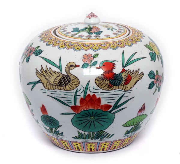 • China / Jingdezhen / Fen Cai (Famille Rose). Melon ginger jar.  Potiche em porcelana chinesa de pasta dura. Rica policromia pintada à mão overglaze. Design de Pato de Mandarim, flor de lótus, buquês de flores simboliza felicidade, lealdade e união. Altura 24cm x Diâmetro 24cm. Excelente estado de conservação.