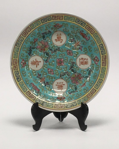• China / Jingdezhen  Prato em porcelana de pasta dura, Famille Rose. Rica policromia em AZUL TURQUESA, pintada à mão overglaze. A expressão Wan Shou Wu Jiang, usada desde 1100 A.C., significa Longevidade sem Limite, Existência Eterna. Marca no verso. Diâmetro 20.5 cm  Excelente estado de conservação