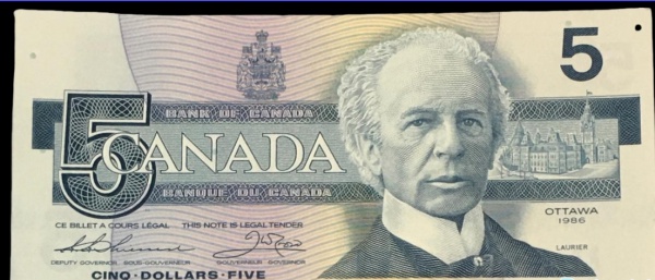 • 5 DOLLARS estampa: Sir Wilfrid Laurierreverso: pássaro FE - sem sinais de circulação ou manuseio