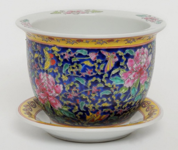 • China / Jingdezhen /  Família Rosa. Porcelana de pasta dura, policromia, pintura overglaze em relevo.Cachepot com presentoir. Sobre o fundo esmalte azul, é pintado, peônias com folhagens, borboletas voando entre floras.  Borda superior, 4 ramos de peônias. Borda inferior, uma faixa amarela com ramos e flores. Sousplat com faixa amarela na borda, decorada com moedas antigas chinesas. Marca no verso do sousplat. Excelente estado de conservação.Altura 17 x 23 cm.