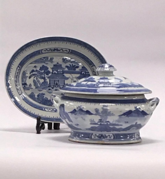 • China / BLUE CANTON.  Terrina Macau ou Pagode com presentoir. Em porcelana Jingdezhen de pasta dura. Esmalte azul e branco underglaze. Clássico design de Wu-tong Chinese parasol tree, paisagem de montanha, rio, pontes e pagodes. Altura total 23 cm.  Presentoir - 30,5 x 24 cm. Marca no verso Excelente estado de conservação