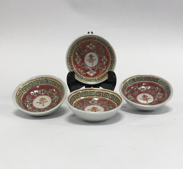 • China / Red Wan Shou, Jingdezhen, Famille Rose. Conjunto de 4 pequenos covilhetes. Porcelana de pasta dura. Rica policromia em vermelho/rosa, pintada à mão overglaze. Clássico design Wan Shou Wu Jiang com um caractere chinês Shou, que significa Longevidade. Marca no fundo. Diâmetro 6.5 cm x Altura 2 cm. Excelente estado de conservação.